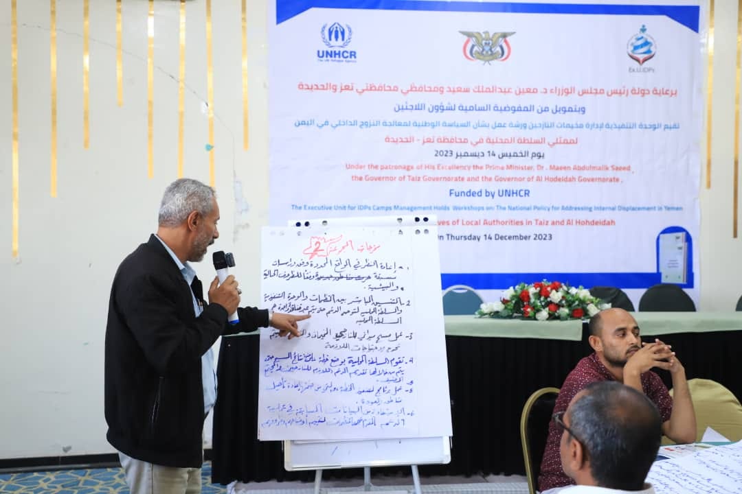 من جانبة أوضح مدير مكتب الوحدة التنفيذية في تعز على قائد أن هذه الورشة تأتي في إطار تكامل العمل الإنساني الرسمي بالمحافظة، والتعريف بالسياسة الوطنية لمعالجة النزوح الداخلي في الجمهورية اليمنية، والتي تم إقرارها من قبل رئاسة الوزراء في العام 2013 كوثيقة حكومية تهتم بالملف الإنساني في اليمن وقضايا النزوح الداخلي، وتعمل على حماية ومساعدة النازحين ومعالجة أوضاعهم، متمنيا للمشاركين التوفيق والخروج بتوصيات ومخرجات للاستفادة منها في معالجة قضايا النزوح الداخلي بمحافظتي تعز والحديدة على وجه الخصوص.