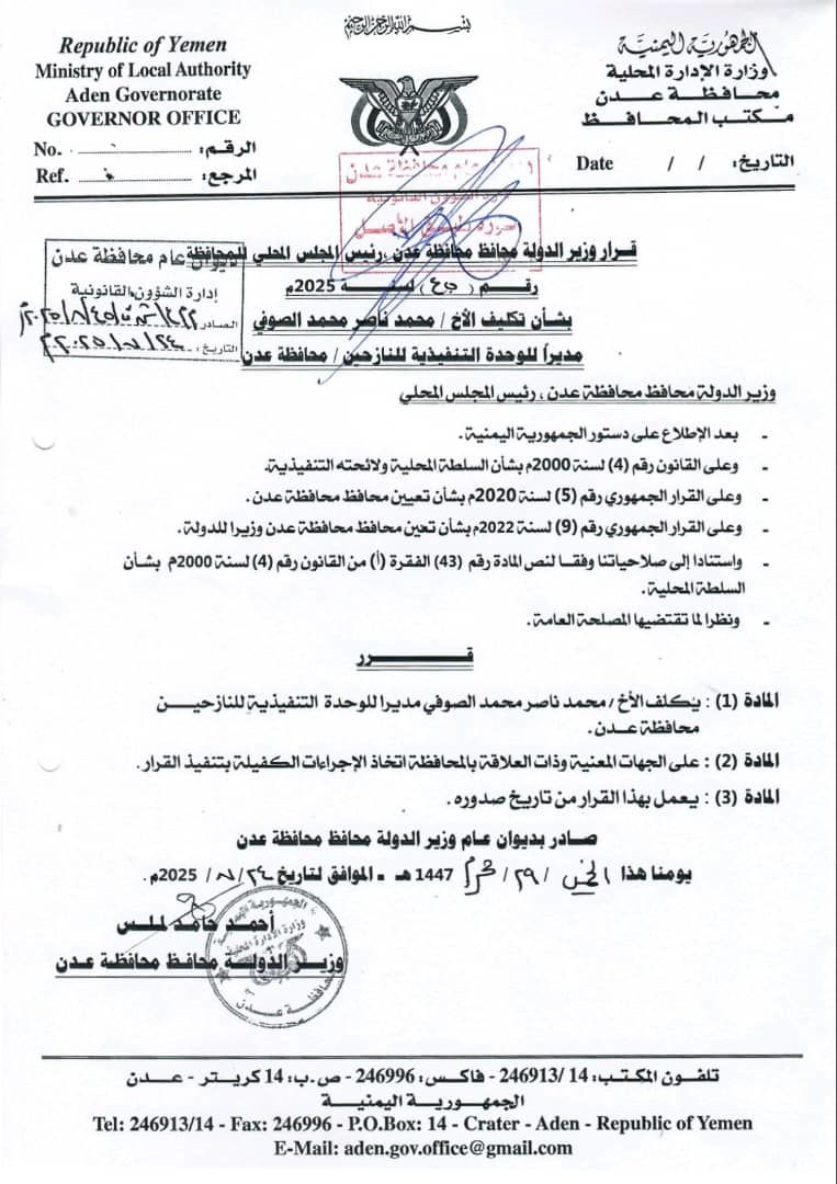 وكان وزير الدولة، محافظ عدن، أحمد لملس، أصدر قرارًا أواخر شهر يوليو الماضي، بتكليف الصوفي مديرًا للوحدة التنفيذية لإدراة مخيمات النازحين في المحافظة.