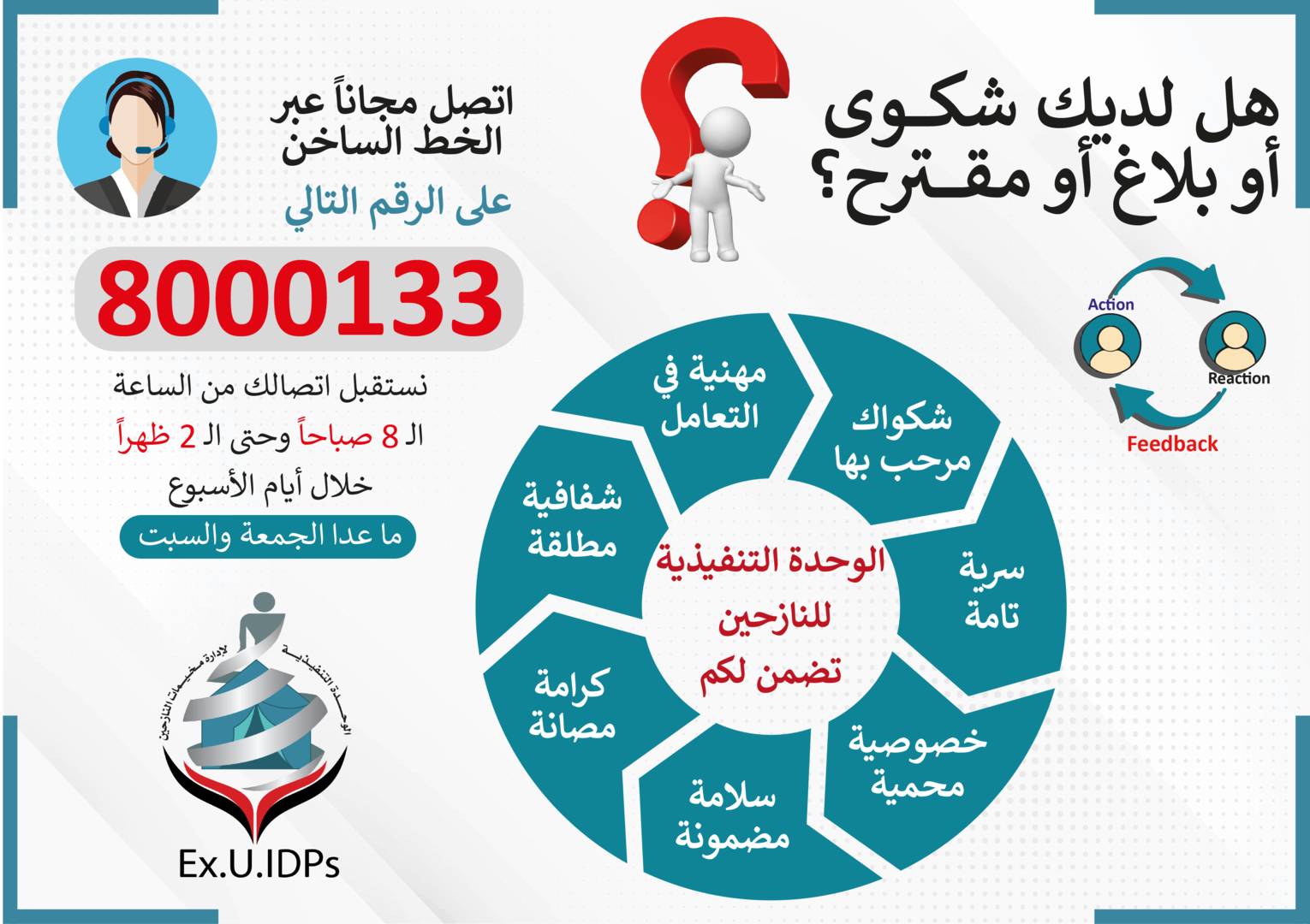 الشكاوى والاقتراحاتإذا كان لديك شكوى أو اقتراح يمكن التواصل مع الوحدة التنفيذية للنازحين من خلال المعلومات في الصورة:الشكاوىالشكاوى